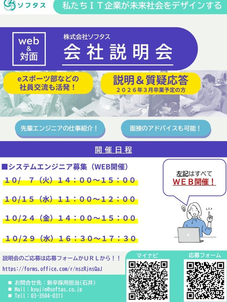 開催前日までに kyujin@softas.co.jp 宛にメールにてお願いいたします。