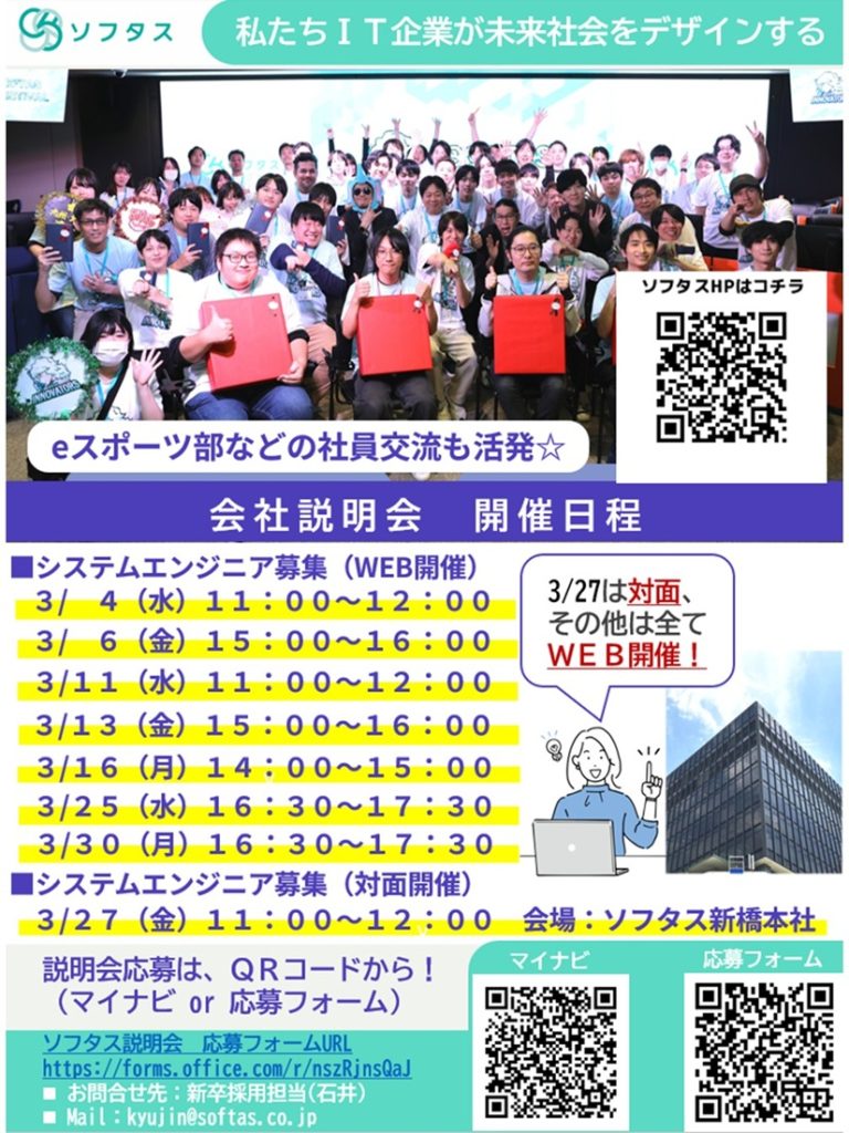 開催前日までに kyujin@softas.co.jp 宛にメールにてお願いいたします。