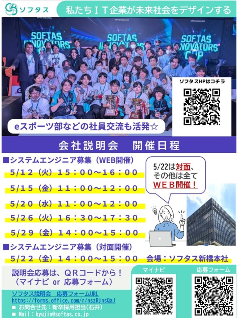 開催前日までに kyujin@softas.co.jp 宛にメールにてお願いいたします。